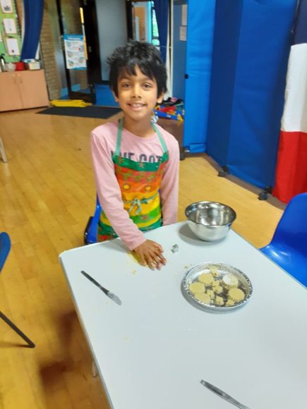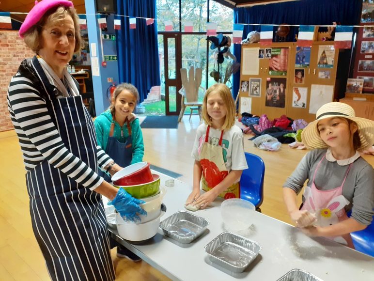 BackAs year 5 were unable to make their usual autumn half term trip to Boulogne this year, Madame Moore decided to bring France to Dolphin. Year 5 came in early at 7.30am to enjoy a real French 'petit déjeuner' complete with croissants and pain au chocolat. Then instead of going to la boulangerie they made their own 'petits pains' and used their knowledge of French numbers to take part in a skittles competition at 'le bowling'. They also made their own biscuits inspired by a simple recipe from 'la biscuiterie d'Hardelot'. Then with the smell of freshly baked bread pervading the hall the Year 5s proceeded to buy their French lunch at the 'marché' - jambon, fromage, chips, yaourt, pomme , orange and banane were all to be heard as they asked politely for their wares and paid with imitation euros. Some of the girls even found time to deliver a 'pique-nique' to the Headmaster. In the afternoon in lieu of their pilgrimage to the Commonwealth War Graves Commission Cemetry just outside Boulogne and following on from their war memorial trail earlier in the month, the children prepared to lead the Remembrance Service to be held after half term. After all that hard work they enjoyed some well-earned 'crêpes' before settling down to watch a movie - in French, of course, but with English subtitles. It was a very happy, but tired group of children who were the last to leave the site on that Friday to start their half term holiday.