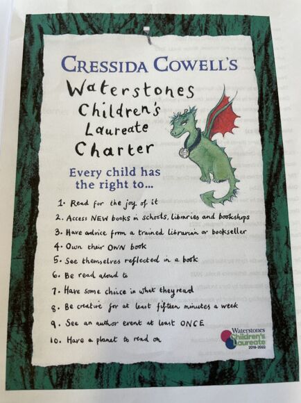 A huge THANK-YOU to all who participated and contributed to the success and enjoyment of our 2022 BOOK FEST! From the fabulously-fun drawing experience with Chloe Inkpen, the lively Train Adventures of Sam Sedgman and the gentle philosophical musing of Sebastian de Souza on ‘Why We Need Weirdos’ – it was high entertainment all round. Laura Brand gave us a very busy and popular up-cycled ‘Shadow Puppet’ session – for more ideas on how to keep the kiddies creative, look no further than her book ‘Joy Journal for Magical everyday PLAY’. Thanks too to FunRaisers for running the Dolphin Book Café and stalls, to Judy, Matthew and Ruby for the very novel and inspiring Poetry Pharmacy and to our pop-up bookshop ‘Mostly Books’ who offered a wide cross-section of titles – something for everyone! For those of you who might have missed it – I have included below, Chris Routh’s recommended reading List along with Cressida Cowell’s Waterstones Children’s Laureate Charter….